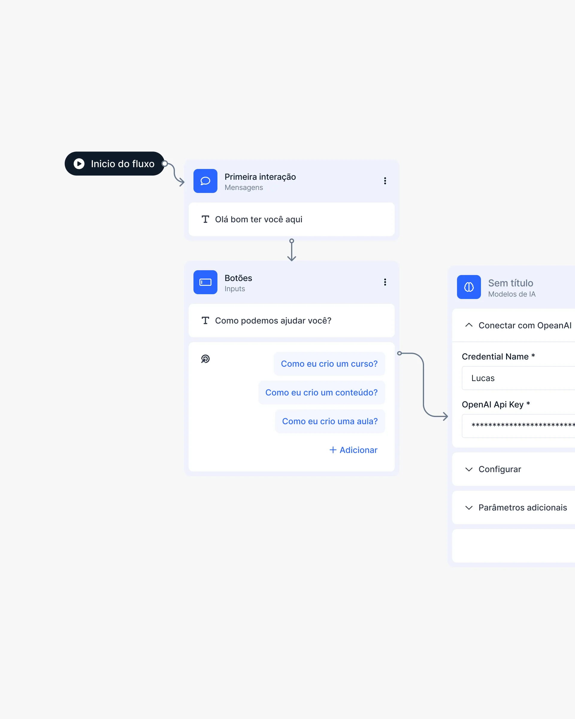 Esses bots podem ser configurados com respostas automáticas ou dinâmicas, utilizando dados provenientes dos Datasets e de provedores de IA, garantindo interações mais inteligentes e personalizadas.